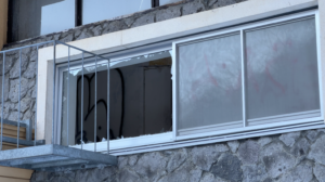 窓ガラスが破られ中がスプレーで落書きだらけ